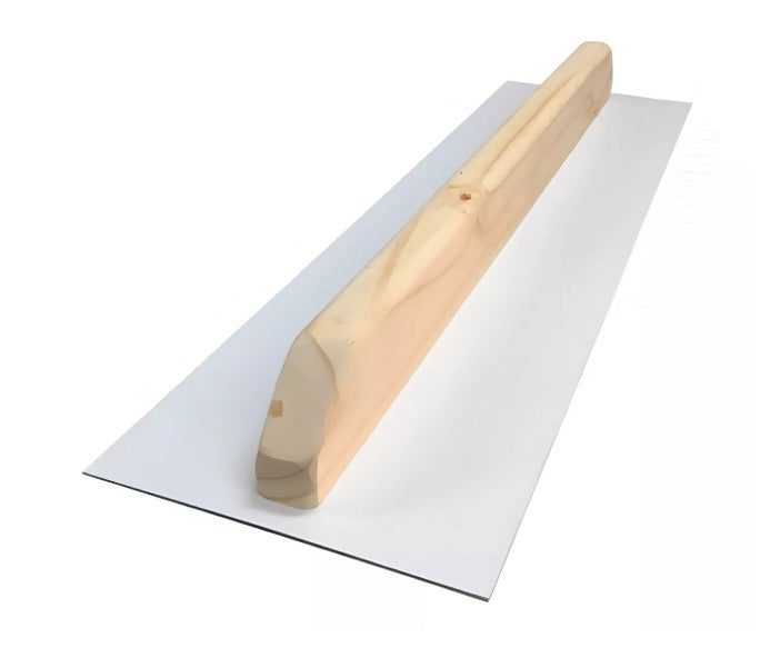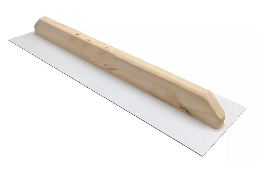 A Desempenadeira Blindada apresenta um cabo de madeira que proporciona conforto ergonômico durante o manuseio, além de uma aderência firme e segura. Seu tamanho é ideal, sendo de 20x70cm, que permite uma cobertura eficiente e rápida ao revestir paredes com gesso (estuque), massas e outros materiais.